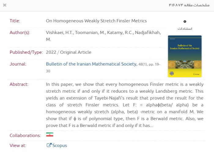 [8] On Homogeneous weakly stretch Finsler metrics, Bull. Iran. Math. Soc. 48, 1930 (2022). (M. Nadjafikhah, H. Tondro-Vishkaei, M. Toomanian and R. Chavosh-Katamy)